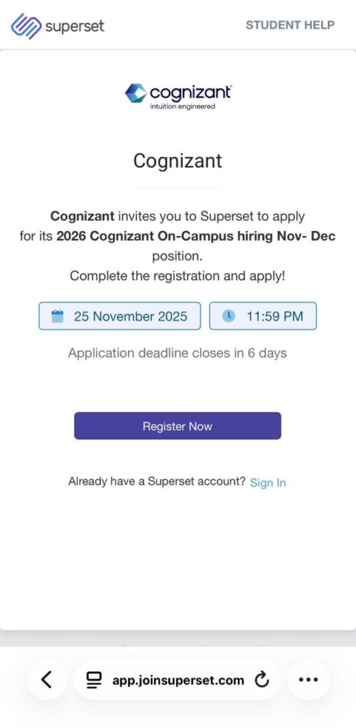 Cognizant invites you to Superset to applyfor its 2026 Cognizant On-Campus hiring Nov- Dec position.Complete the registration and apply!By yogeswartech / November 19, 2025 Apply Link : https://app.joinsuperset.com/join/#/signup/student?jp=646c344f-7e0c-4d40-aef8-3b3fc8430245